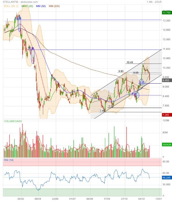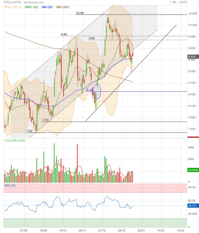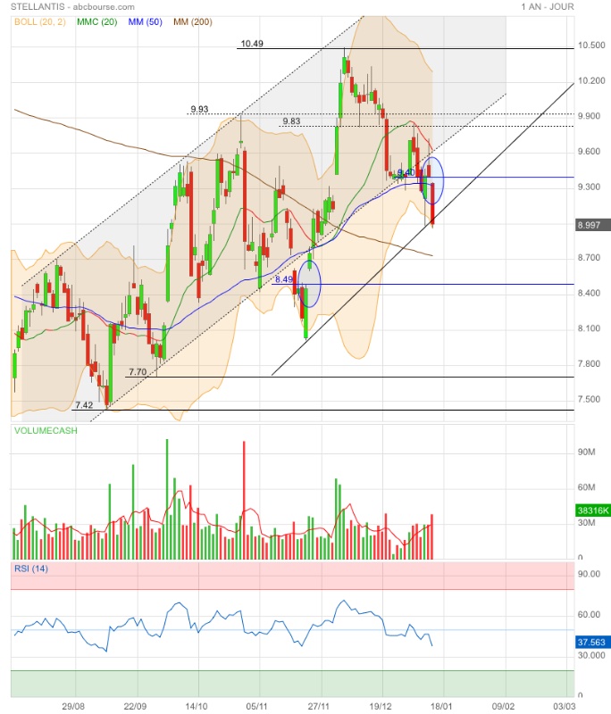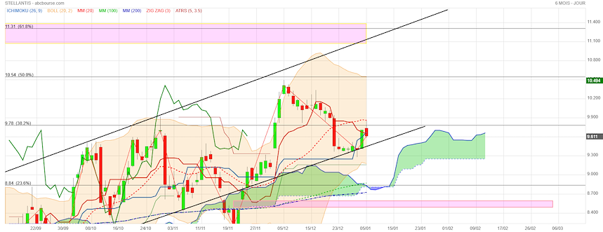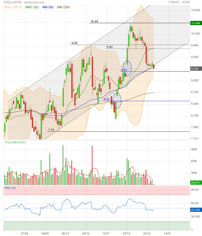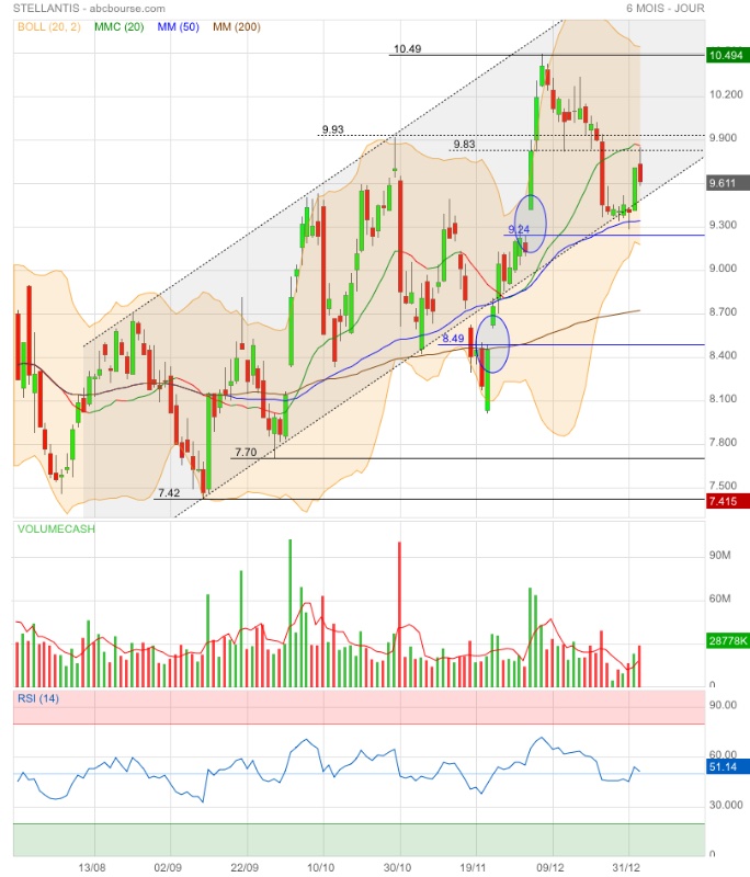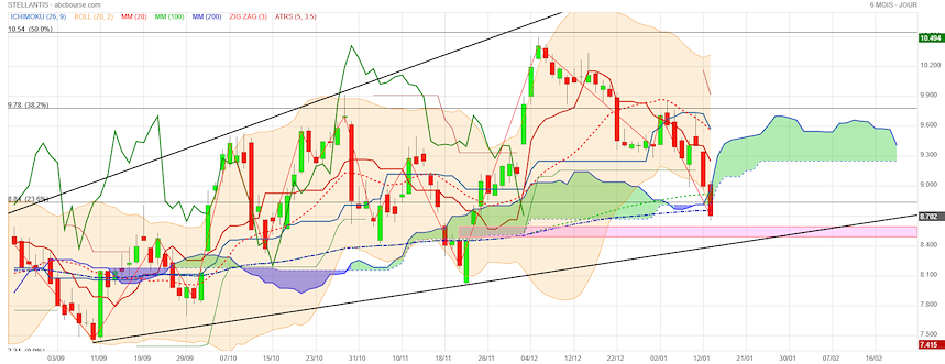 Sur la vue 6 mois, Stellantis reste dans une phase de correction après son pic de décembre (10,49 €) :
