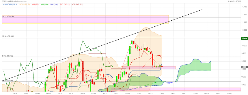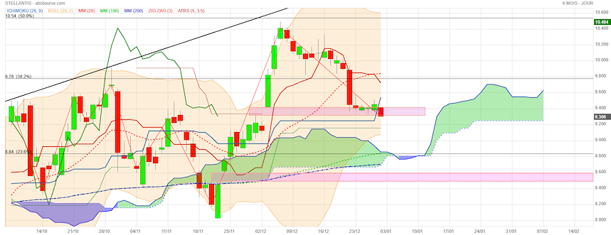 Ichimoku : Le titre termine l'année sous le nuage (Kumo). La zone de résistance majeure se situe désormais entre 9,50 € et 9,65 € (bas du nuage). La clôture à 9,40 € reste fragile car elle ne réintègre aucune zone de sécurité technique.