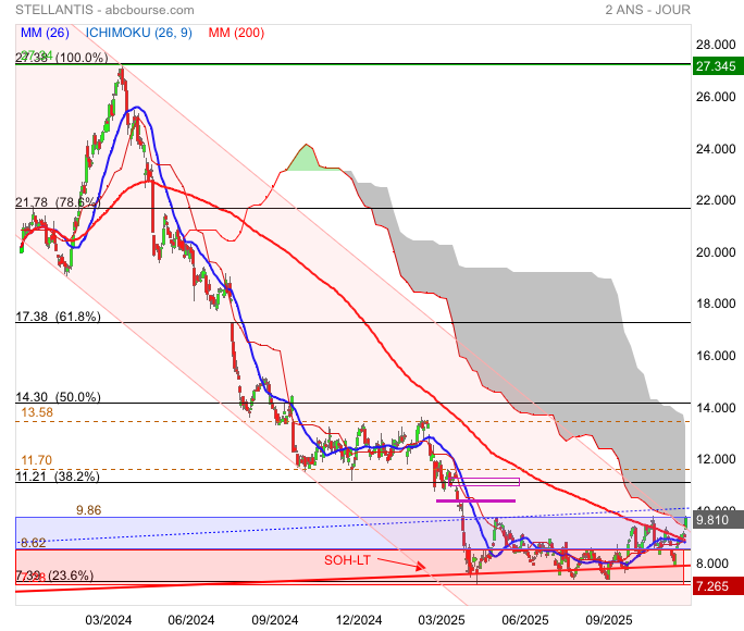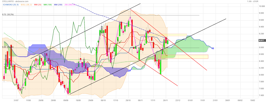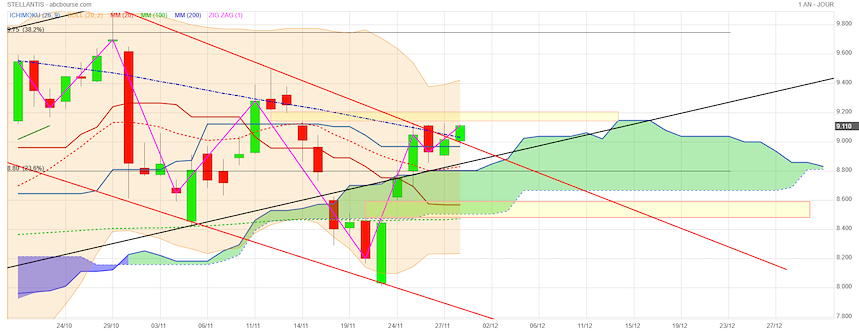 • Tenkan & Kijun : Le cours est au-dessus de la Tenkan (8.57) et de la Kijun (8.96). C'est positif. Le support immédiat est la Kijun à 8.96. Tant qu'on ne clôture pas dessous, la dynamique court terme tient.