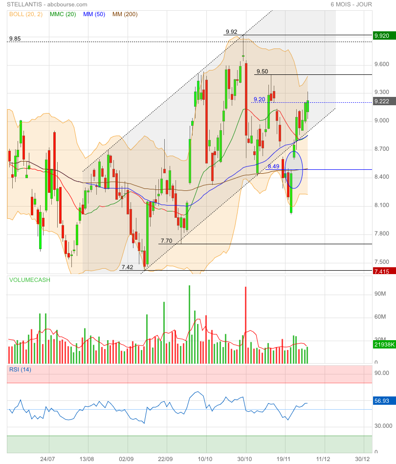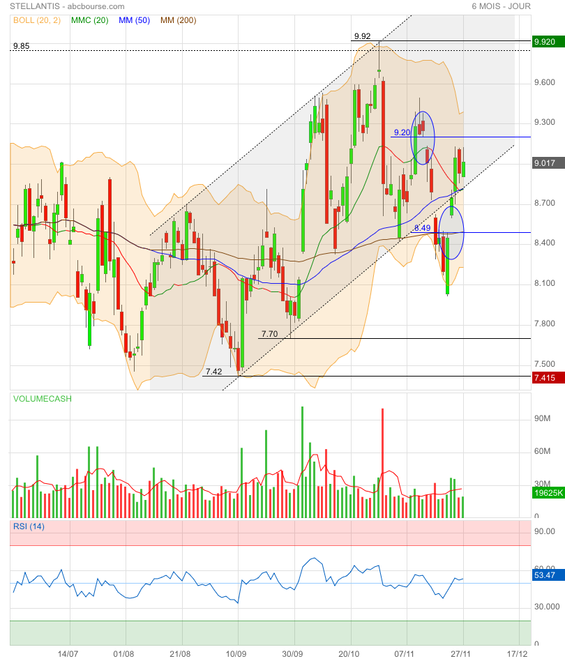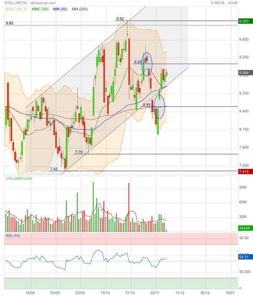 Les dernières bougies montrent une pression acheteuse qui défend la zone des 9.00 €.