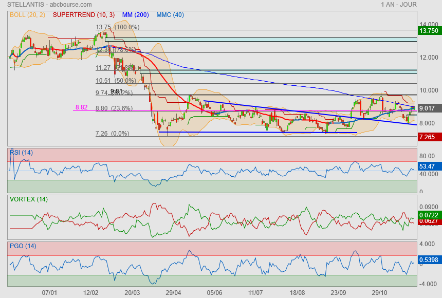 • Le Mur de la MM200 (9.05) : C'est la donnée la plus importante de votre liste. La Moyenne Mobile 200 jours est à 9.05, et le cours est à 9.02.