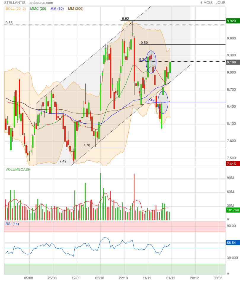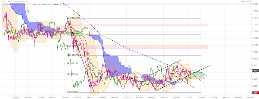 Le signal clé (MM200) : Le cours actuel (9.20) vient de passer au-dessus de la MM200 (9.03). C'est un signal technique majeur indiquant que la tendance long terme pourrait passer de baissière à haussière.