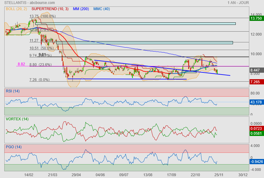 Le cours évolue plus dans un canal latéral qu'un canal haussier. Depuis fin Octobre, il évolue dans un canal franchement baissier dont la borne haute vient d'être atteinte.