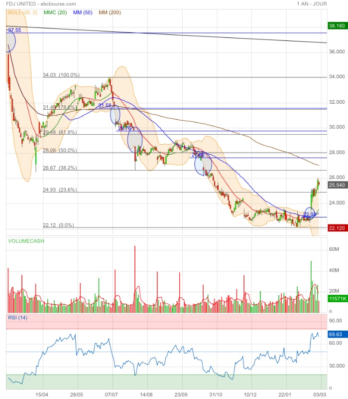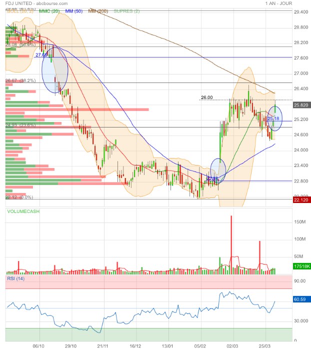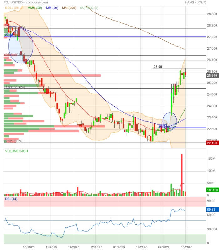 Cela fait partie du jeu et c'est ce que les investisseurs vont finir par intégrer. FDJ United reste un véhicule de grande qualité dans un secteur relativement décorrélé des aléas de la conjoncture, le jeu faisant preuve d'une bonne résistance dans les périodes de vaches maigres. Le groupe ajoute à cette caractéristique sectorielle des atouts spécifiques. Tout d'abord, il y a une base saine représentée par les jeux traditionnels, les loteries sur site ou en ligne et les paris sportifs en point de vente, protégés par le fameux monopole. La diffusion du numérique y génère une dynamique d'amélioration de la rentabilité et l'objectif reste d'atteindre une marge d'Ebitda supérieure à 26 % (24,5 % en 2025) d'ici à 2028 au niveau du groupe.