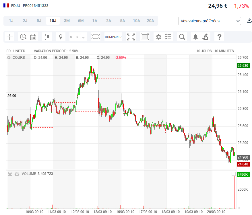 Les ennuis ont commencé par l'enquête de la Commission européenne sur la question de l'avantage éventuellement indu que pouvait représenter le monopole dont bénéficie la FDJ sur une grande partie de son activité. L'idée qu'une soulte devrait probablement être acquittée en guise de compensation a pesé sur le titre comme une épée de Damoclès jusqu'en 2024.
