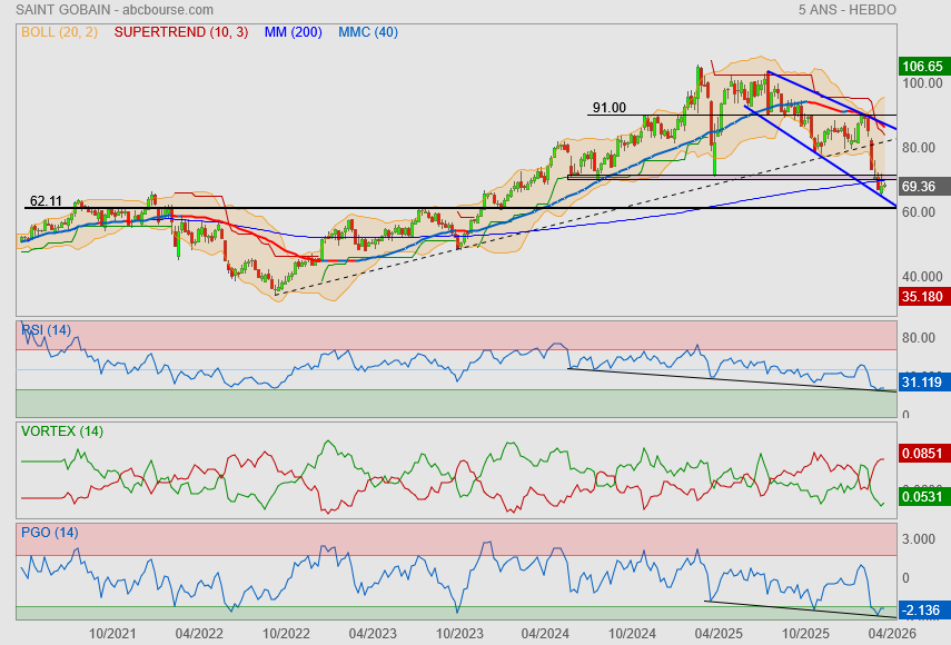 les points bas du moment se font proche du Fibo 61.8% et d'un gros plat de supertrend (71/72€).