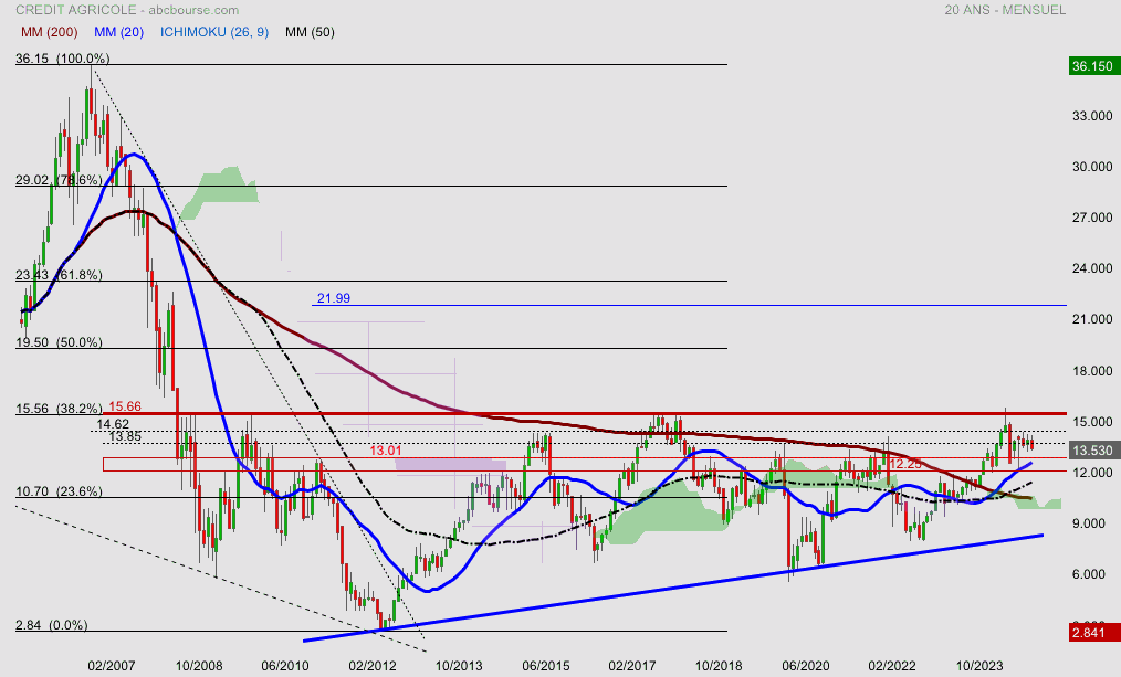 Le cours a échoué une nouvelle fois sur la résistance 15.60 matérialisé par le ratio finobacci 38.2%, cet échec renvoie certainement sur la zone de supports (12.25-13.10) ou gravite la mm20… pour l’instant rien de grave , quand un prix échoue plusieurs fois sur une résistance majeure il tendance à reprendre appui sur un point de support afin de repartir à l’assaut de la forteresse