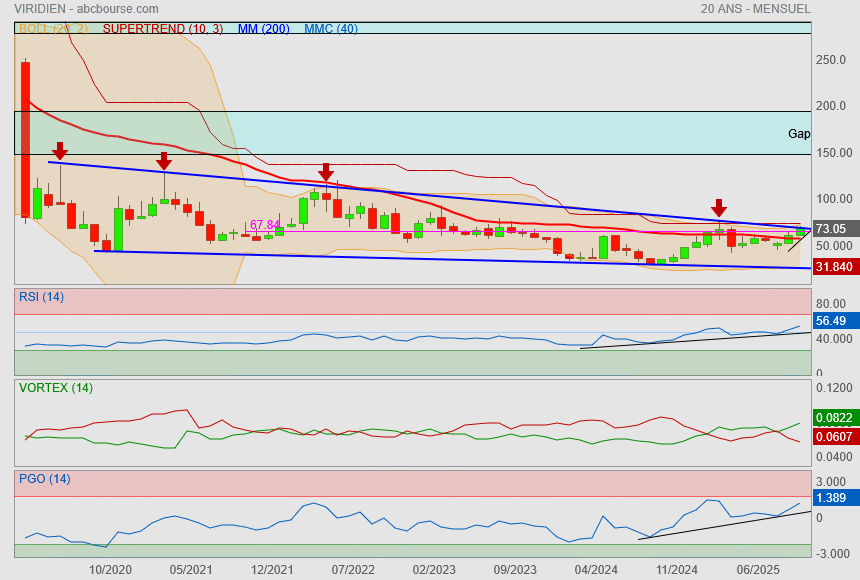 La valeur teste en hebdomadaire RH:64.27 couplé à la mm200, le franchissement de ces obstacles libèrerait le potentiel (47.68-64.27) soit 18€ >> 82€ soit strictement le PH 2025
