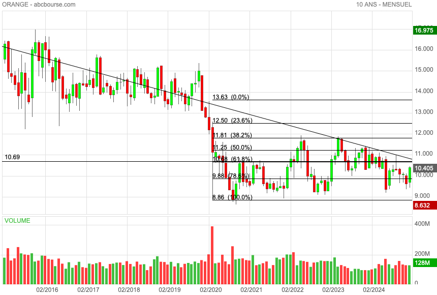 il est intéressant de regarder un graphique sur une période assez longue , alors si on regarde l'évolution du cours d'orange au cours des 5 dernières années , on constate qu'on est dans un range entre 9 et 12 euros environ . Peut être qu'il serait temps d'en sortir après une demie décennie. Il faudra alors suivre l'évolution en bougie mensuelle du cours de l'action qui pourra ainsi nous donner une orientation sur l'avenir du cours d'Orange. Rappelons néanmoins qu'orange distribue un dividende qui a évolué autour des 0,70 euros , ce qui fait environ 3.5 euros pour les 5 dernières années à rajouter au cours de l'action si on veut intégrer ces dividendes.