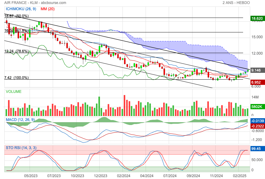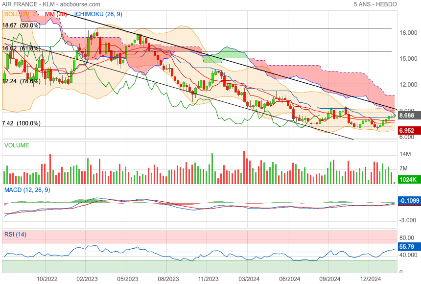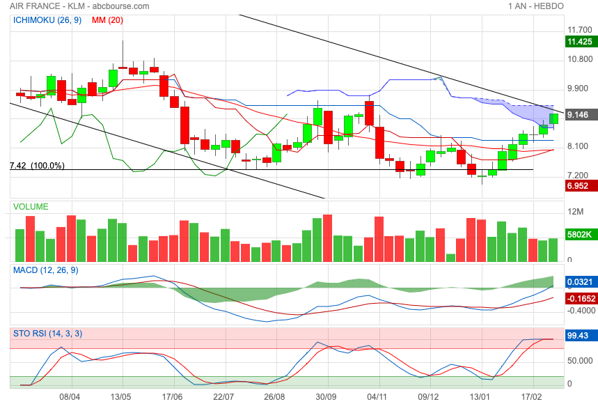 l'action prend son envol depuis quelques séances et il faudra suivre attentivement l'évolution au cours des prochaines séances, pour voir si le nuage ichimoku est traversé. Les indicateurs en bougies hebdomadaires semblent intéressants à consulter et chacun se fera sa propre opinion. Je suis personnellement haussier sur le titre , avec la reprise des voyages, la baisse du prix des carburants et l'extension du réseau Air France klm . un retour prochain vers les 9,60 euros ne me parait pas impossible , soit un peu plus de 10% par rapport au cours actuel . A suivre ...actionnaire