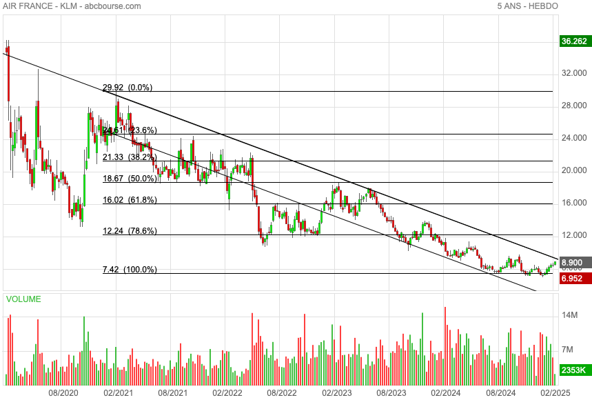 L'accord avec les pilotes chez KLM pourrait être a l'origine de cette progression qui pourrait graphiquement nous conduire rapidement vers la prochaine résistance autour des 15.2 et 15.8 €.