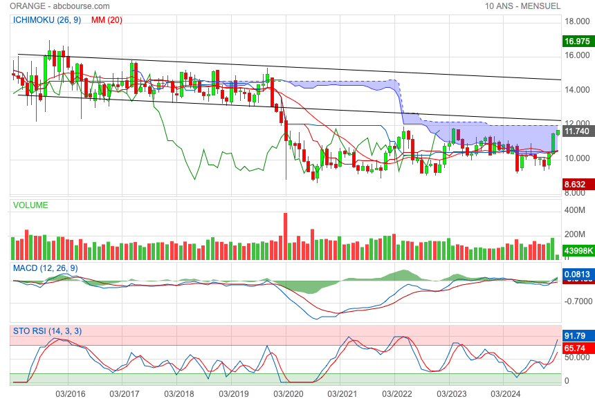 une vue plus globale sur les 10 dernières années . Personnellement, je pense qu'orange va retrouver son range entre 13 et 15 euros.
