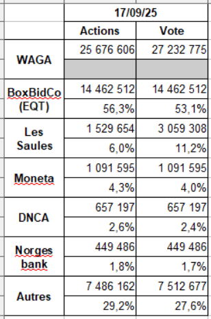 Le déclarant a précisé détenir, au 1er septembre 2025, 2 958 686 actions WAGA ENERGY représentant 5 807 415 droits de vote, soit 11,90% du capital et 14,92% des droits de vote de cette société