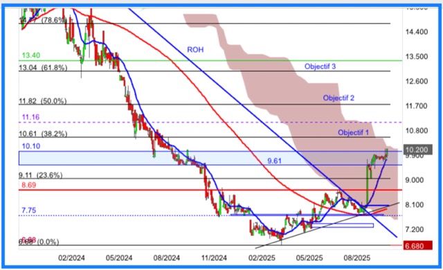 Nous sommes prêt du bonheur SENKOU B ichimoku hebdomadaire (10.28€) qui libèrerait un nouveau potentiel haussier ~~10.61€>>11.16