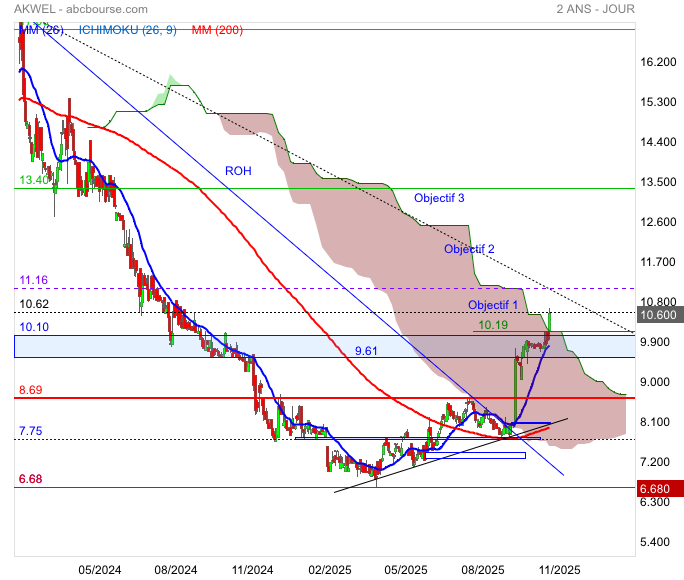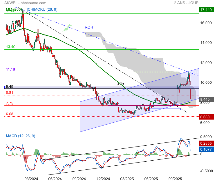 Akwel continue son retournement franchissant 8.32€ ouvrant la fermeture du gap 8.94€
