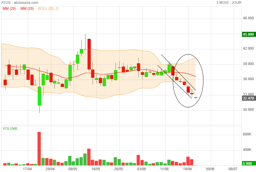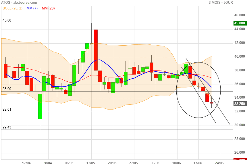(CercleFinance.com) - Atos valide une sérieuse alerte baissière avec la franche cassure des 34,6E, le plancher des 24 avril et 5 mai (et 20 mai également).