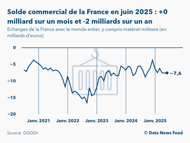 Selon les chiffres de la https://lekiosque.finances.gouv.fr/APPCHIFFRE/Portail_default.asp" rel="noreferrer" target="_blank">Direction générale des douanes, le solde commercial de la France s’élève à -7,6 milliards d'euros en juin 2025. Le déficit du commerce extérieur se réduit ainsi de 0 milliard d'euros par rapport au mois précédent. Sur un an, le solde des échanges commerciaux de la France avec le monde entier se dégrade de 2 milliards d'euros.