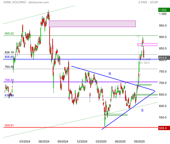 ASML est sortie par le haut de son triangle isocèle (RS) validant un objectif de 909
