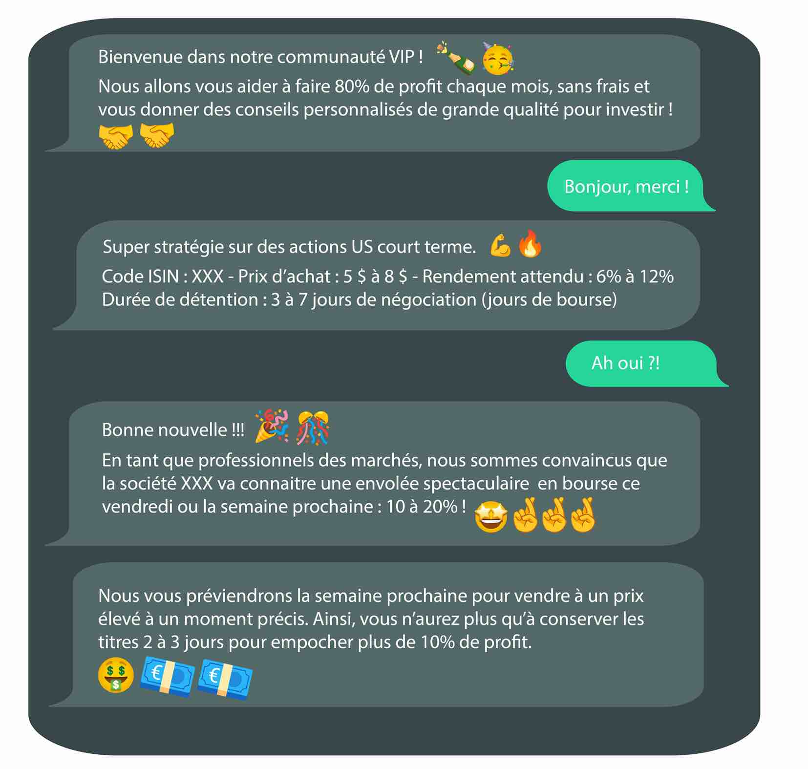 Ces dernières semaines, plusieurs épargnants ont contacté l’AMF afin de signaler ce type d’approche dont la capture d’écran présentée ci-dessus est bien réelle. L’AMF appelle le public à la plus grande vigilance face à ces propositions qui présentent les caractéristiques de la pratique frauduleuse de type « bouilloire » (ou « pump and dump »). Les épargnants témoignent avoir cliqué sur des publicités sur internet ou les réseaux sociaux et avoir rejoint des groupes de discussions sur des messageries privées telles que WhatsApp. D’autres ont été intégrés à ces groupes de discussions sans même en avoir fait la demande. A chacun, il a été proposé d’investir dans des actions, souvent américaines, en leur faisant miroiter des gains importants en seulement quelques jours. Après une phase de hausse, ces actions se sont finalement écroulées et, aujourd’hui, ces personnes indiquent à l’AMF avoir perdu l’essentiel de leur investissement.