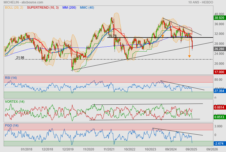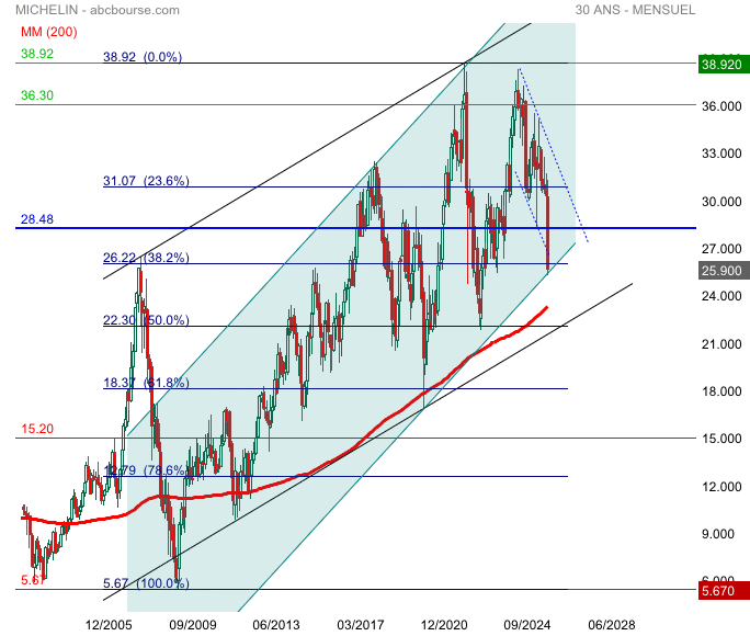 ( a cédé - merci) . Un avis éclairé : hier de 17h25 à 17h30 se sont échangés chaque minute environ 5000 titres de Michelin et à 17h 35 est apparu un échange d' environ 1500000 titres !!! Comment analyser : ventes de panique au seuil de 28.66 et des achats d'opportunité , ventes à découvert ?