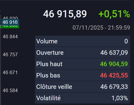 Le haut de vendredi est donné à 46904.59 et une clout à 46915.89