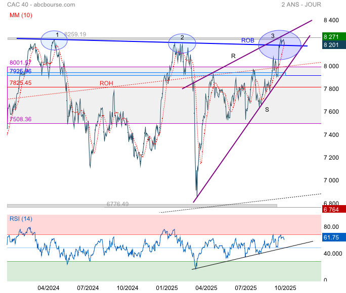 Le cours évolue tjrs >> ROB droite joignant points clôture quotidienne (1-2-3) mais sans accélération ce qui a permis à la mm10 de rejoindre le cours , soit elle va pousser sur des ++ hauts soit soit une consolidation