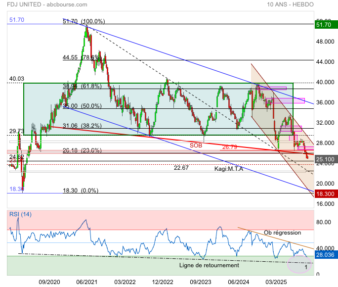 pas de grande baisse mais une dérive progressive, depuis (29.73-31.06),Cassure du dernier fibonnacci 26.18€ + ROB+GAP