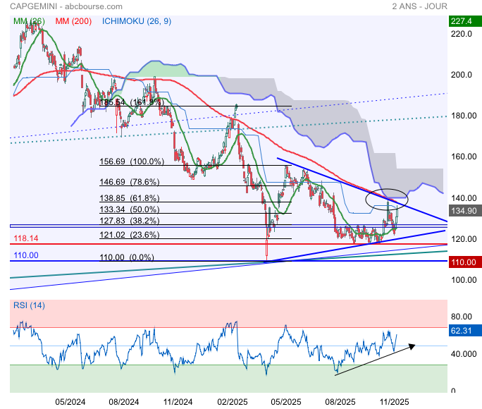 Le cours retrace le mvt(110-156.69) franchissant ce jour 50% 133.35, cette construction se fait dans un biseau, mais la sortie devrait être délicate , un mur (kijun (136) +(mm200 138)+fibo 61% 138.85)+ SenkouA ichimoku hebdo 139
