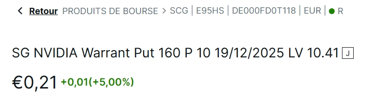 Donc le warrant Put 160 NVIDIA (E95HS) parait très intéressant et finalement peu risqué surtout si les résultats sont décevants ou juste dans les prévisions.