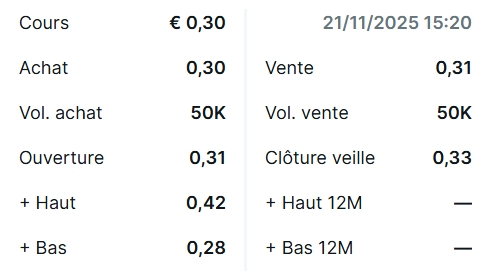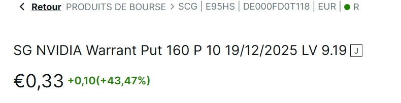 Et oui, pourquoi pas , un peu moins d'une chance sur deux pour que NVIDIA déçoivent mercredi, mais si c'est le cas, ce put warrant (et ils sont assez rares) est bien adapté, et peut très bien doubler en quelques jours ou quelques heures ! Une échéance d'un mois, qui nous laisse même une petite marge de sécurité, un prix actuel de 0.20 et un levier de 10 pour le moment.