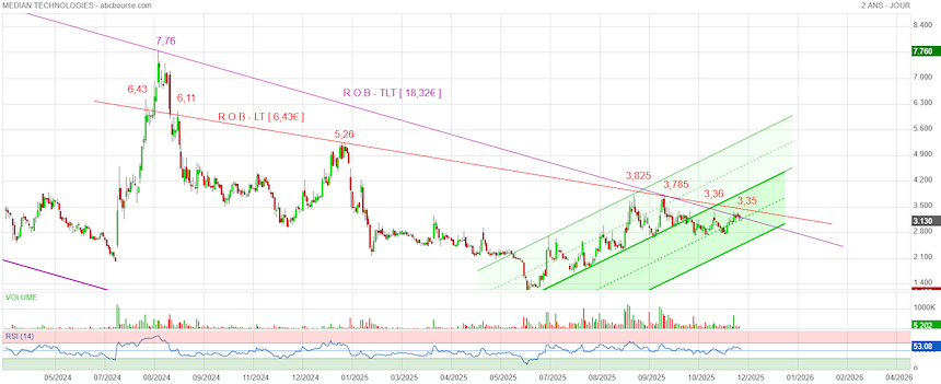 Le vrai passage libérateur semblant être lié à la ROB LT en rouge avec 4 derniers échecs à 6,11€ / 5,26€ / 3,825€ / 3,785€.