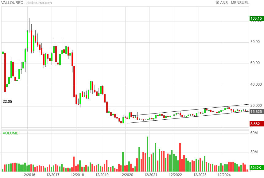En traçant le canal haussier dont on se trouve actuellement sur le support ( à ne pas franchir ) , on pourrait imaginer que l'année 2026 soit favorable au titre et qu'on assiste à une impulsion qui pourrait permettre au titre d'atteindre le niveau de 22 euros d'ici 12 mois.