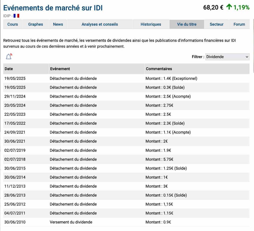 Regardes IDI, c'est vraiment intéressant aussi : j'ai posté des trucs sur le forum. J'ai en fond de portefeuille depuis 2023 acheté un peu plus de 20,00€ de mémoire. Elle présente une décote d'actifs nets (= ANR) . Le bilan de distribution de dividende est éloquent.