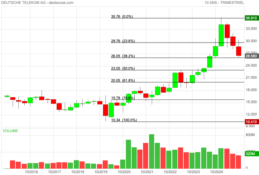 DT avait ainsi connu 5 ans de hausse qui avait fait plus que triplé le cours de l'action durant cette période, passant de 10 à 35 euros environ. Reste à savoir si on va se stabiliser à 26 euros ou si la baisse va se poursuivre jusqu'à 23 euros.