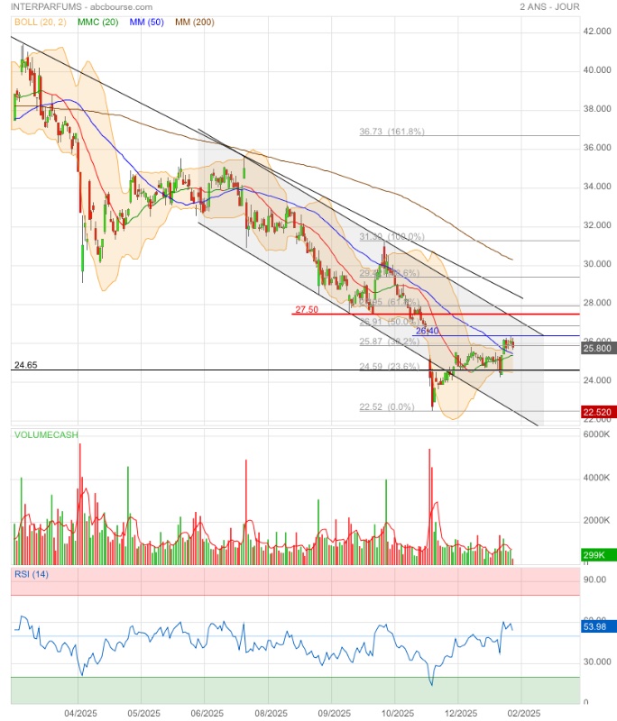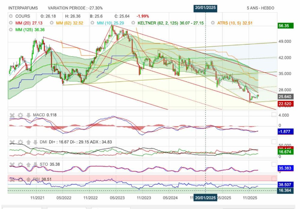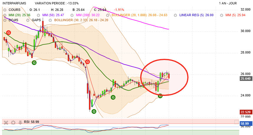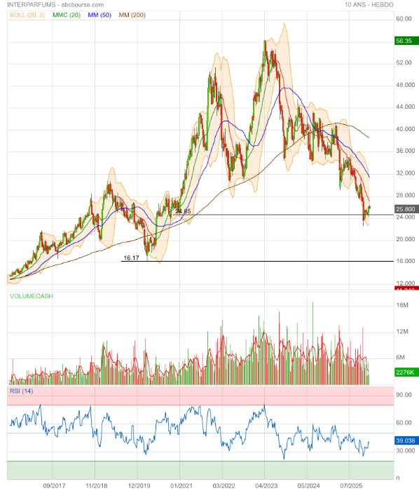 Dynamique. Dans le sillage d'une forte dynamique de croissance, les multiples d'Interparfums ont longtemps été élevés. Ce n'est plus le cas aujourd'hui dans la mesure où le PER 2025 est de 16... La prime qui existait auparavant sur L'Oréal a disparu. Le bénéfice net du numéro 1 mondial des produits beauté sur le dernier exercice est en effet évalué à 28 fois. Cet écart semble appelé à se combler progressivement au vu des derniers propos tenus par le co-fondateur d'Interparfums. Nous misons sur un rebond du titre sur la nouvelle année.