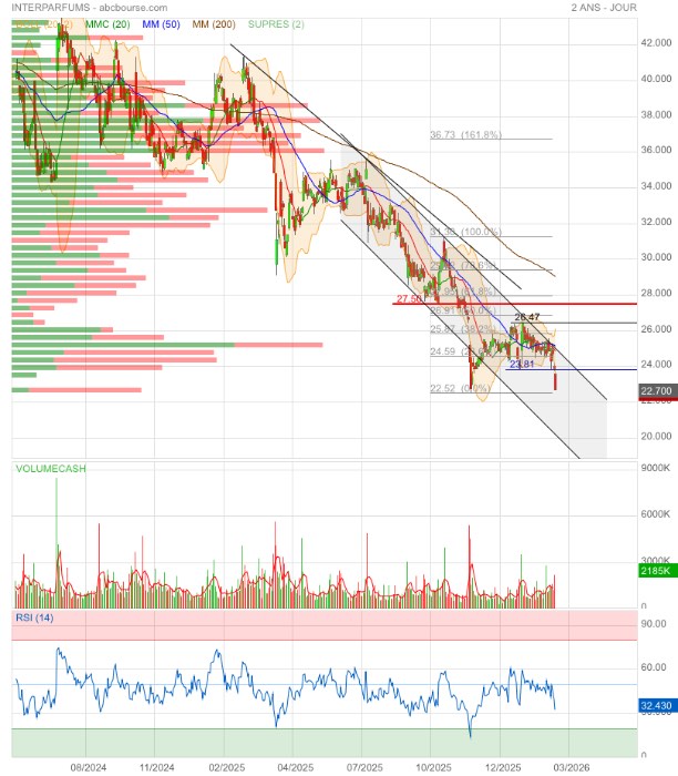 Depuis son record d'avril 2023, à 56,35 €, le cours d'Interparfums a été divisé par plus de deux. Sa valorisation a fondu à 17 fois le bénéfice 2026 estimé, contre une moyenne de 35 fois sur cinq ans. Le marché acceptait de payer très cher le parfumeur, valeur de croissance par excellence. Jusqu'en 2024, son chiffre d'affaires a augmenté de plus de 10 % dans un marché des fragrances très dynamique après la pandémie et dépassait régulièrement les objectifs. A presque 900 millions d'euros en 2025, les facturations ont doublé par rapport à 2018, tandis que les résultats opérationnel et net ont été multipliés par 2,6.