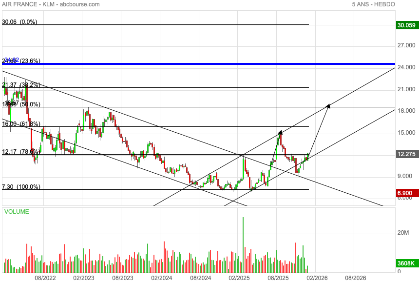 on remarque une sorte de figure récente en tête épaules inversées mais une vision en prenant du recul permettrait d'envisager un retour vers les 18 euros dans un premier temps.