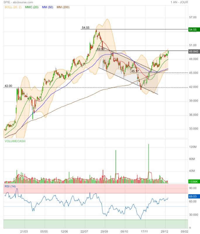 Il faudra casser 49,90 € pour viser 54,55 € ensuite.