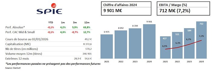 Cotée depuis 2015 et leader européen des services de maintenance dans les secteurs de l’énergie et des communications, SPIE constitue un dossier particulièrement intéressant. Malgré une performance boursière déjà significative, avec une hausse de plus de 60 % en 2025, plusieurs facteurs nous incitent à rester constructifs et ambitieux sur la valeur.