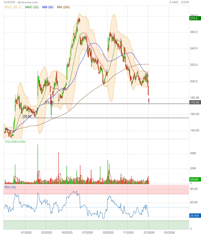« Vusion chute lourdement de 9,99% à 165,70 euros. Après le passage de la recommandation de BNP Paribas à « neutre » et la réduction de l’objectif de cours de 275 à 210 euros, le titre enregistre une quatrième séance de nette correction. Malgré cette révision, la perception globale reste favorable : d’après le consensus Bloomberg, neuf analystes recommandent l’« achat », un le « maintien » et un la « vente », pour un objectif de cours moyen à douze mois de 276,6 euros. »