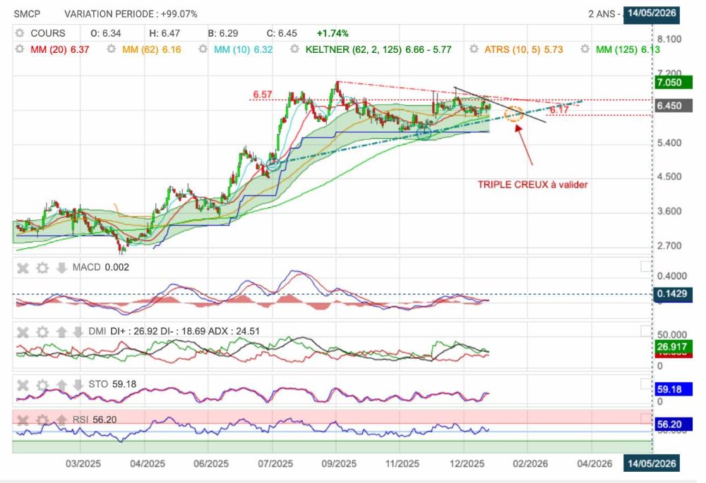 Il y a la menace à la baisse d'aller chercher le triple creux montant sur le support haussier en pointillés verts.
