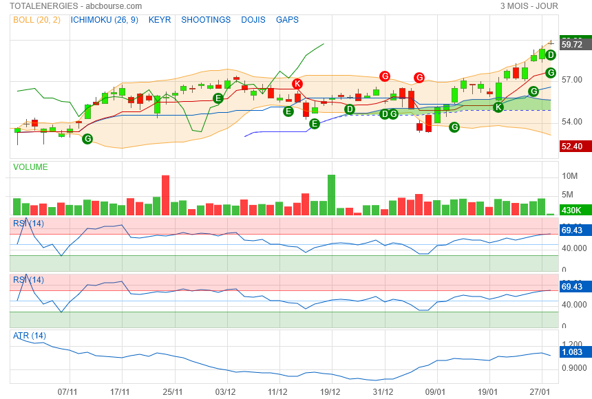 Après le retournement haussier du 20 janvier ( Key Reversal vert) TTE s'approche de la zone de surachat avec un RSI de 69.50 avec des Gaps de plus en plus haut.