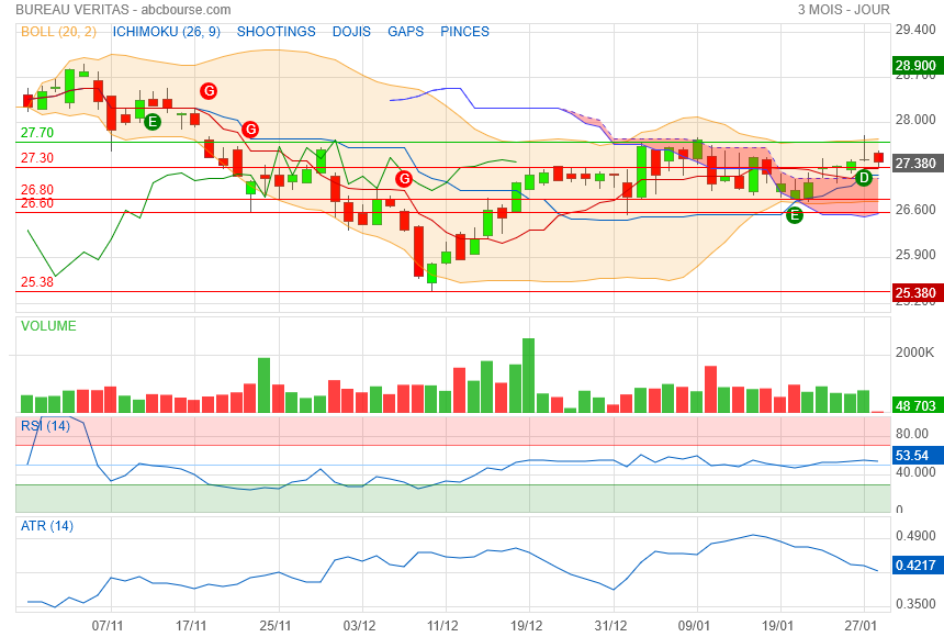Après 5 jours d'achat et le beau DOJI d'hier, les prises de bénéfice aujourd'hui entraine le cours vers la Kijun Sen 27.18 € qui s’aplatie pour un nouveau range (?) sous son Point Pivot 27.69 €.