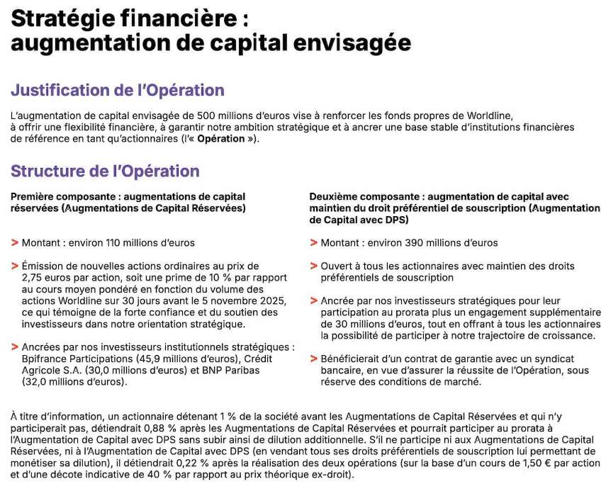 "WORLDLINE : Les positions baissières se sont accrues pour atteindre 28,7% du capital jeudi 15 janvier 2026, contre 25,5% le 30 décembre. Certains actionnaires couvrent ainsi les actions qu'ils devront acheter lors de l'augmentation de capital annoncée "