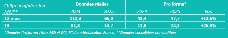 Au cours de l’exercice 2025, le groupe Prologue a enregistré un chiffre d’affaires pro forma de 47,7 M€ en croissance organique de +12,6% par rapport à la même période l’an dernier. En Espagne, désormais premier marché du groupe, le chiffre d’affaires atteint sur l’année 2025 43,7 M€, en croissance de +14,2%. A noter que sur le 4ème trimestre, le groupe a bénéficié d’une vente exceptionnelle d’Infrastructures pour un montant de 2 M€ portant sa croissance sur cette période à +26,8%.