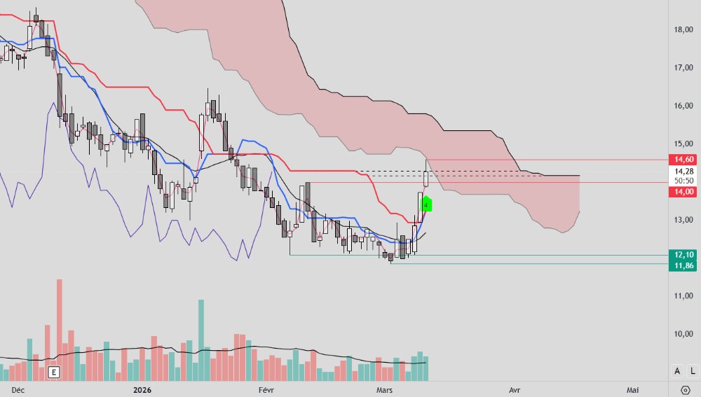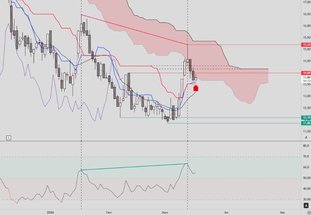 C'est clair qu'il y a du mieux mais attention, déjà la structure ressemble à la précédente, au niveau Ichimoku le cours est stoppé par le nuage et rebaisse sous différents niveaux de résistance, même si la chikou a passé les prix, le nuage futur est rouge et la tenkan est sous la kijun, nous sommes en phase d'accumulation, en zone B ce qui veut dire qu'après avoir mangé l'AR à 14€ le prix "devrait" normalement aller chercher les liquidité en bas pour faire le Spring avant la grande hausse.