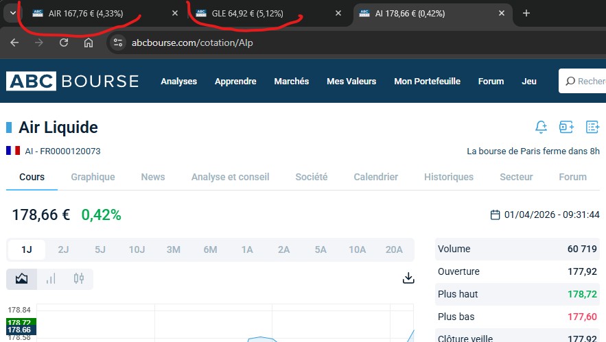 Nous venons de déployer une petite amélioration sur les fiches valeurs qui vous permet, si vous avez plusieurs onglets de navigateur ouverts, de voir dans le titre de l'onglet le code de la société le dernier cours et la variation avec des niveaux qui s'actualisent toutes les 5 secondes.