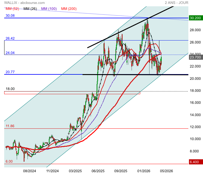 Le cours consolide depuis sa grande vague haussière dans un range 20.77/30.08 mais le + remarquable c’est la coïncidence des mm20/52/100/200 (24.0/24.30)