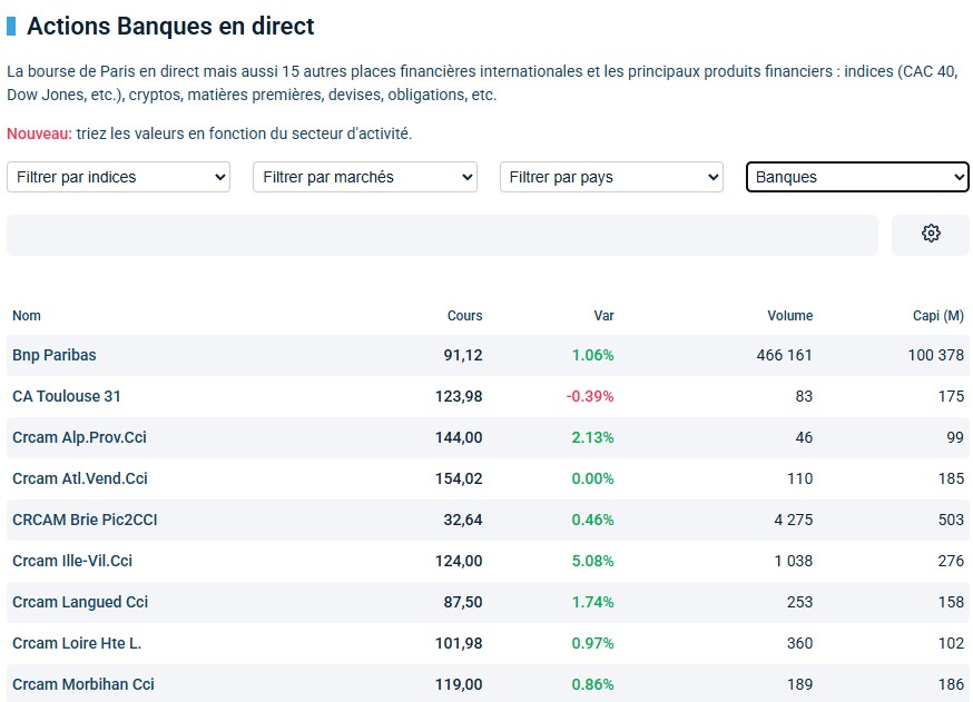 La page des cotations de A à Z s'enrichit d'un nouveau filtre qui vous permet désormais de trier les sociétés par secteurs d'activité.
