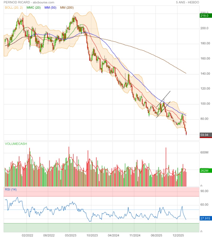 Sur cinq ans, Pernod Ricard perd 61% en Bourse, le leader britannique du secteur Diageo 54% et Brown Forman 60%.